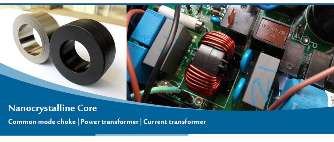 納米晶磁芯具有高導(dǎo)磁率,頻率特性寬,適用于EMC濾波器,共模電感,以及抑制共模噪聲。相對(duì)于傳統(tǒng)軟磁材料,比如鐵氧體磁芯,納米晶磁芯電感量較大,濾波效果,體積小,銅線(xiàn)匝數(shù)少,減少銅損。納米晶磁芯應(yīng)用于共模電感。